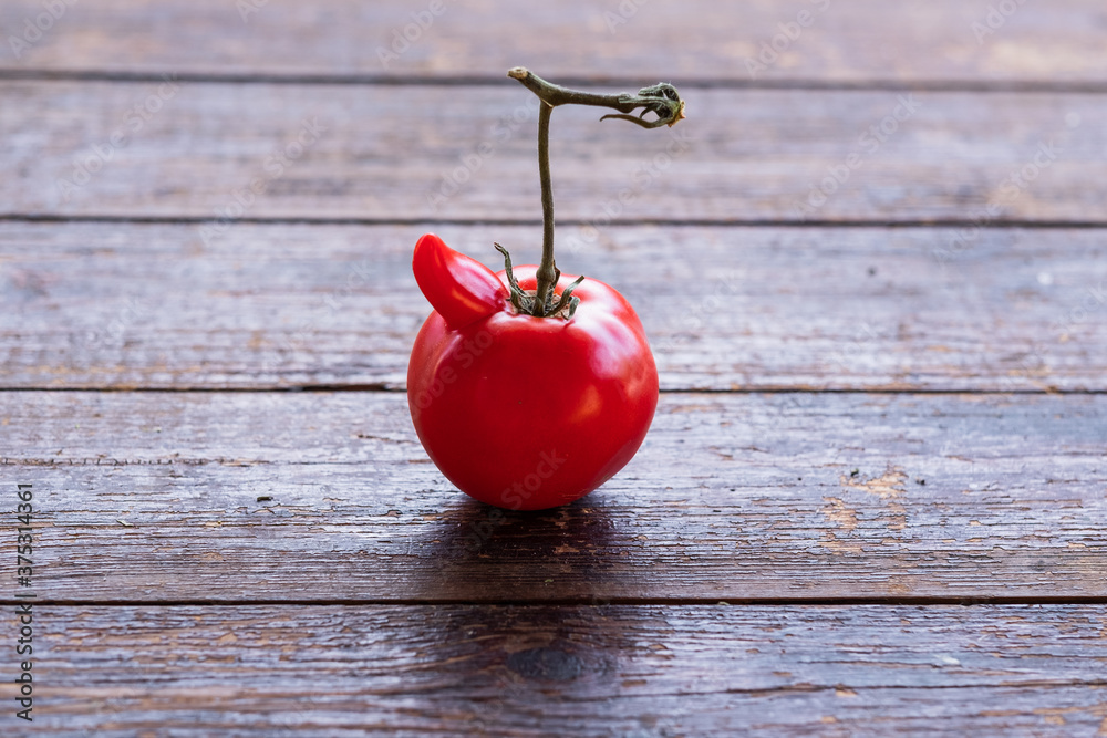 Ugly tomatoes on a wooden background. Funny, unnormal vegetable or food waste concept. Horizontal orientation