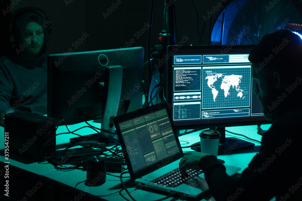 Hackers making cryptocurrency fraud using virus software and computer interface. Blockchain cyberattack, ddos and malware concept. Underground background.