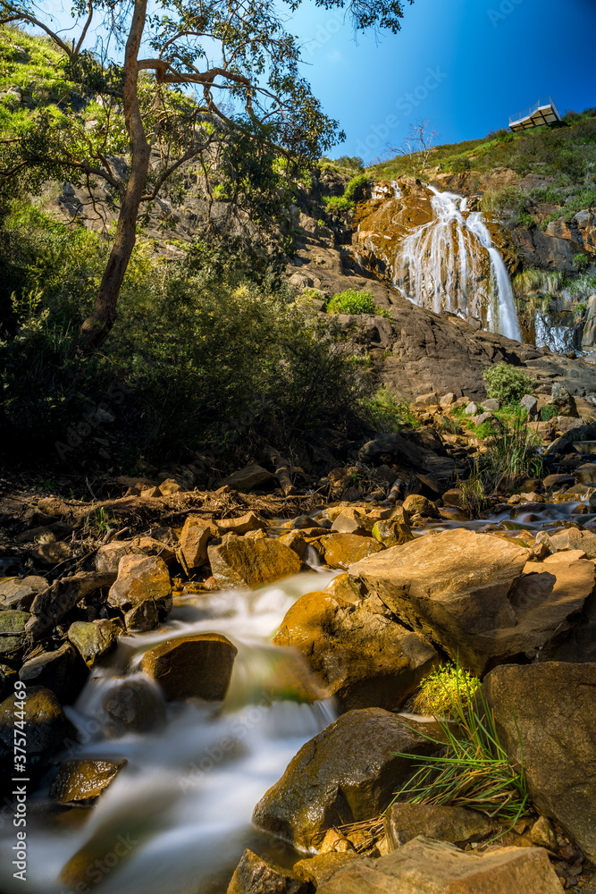 Lesmurdie waterfall in bush forest at regional national park with rock formation and blue sky