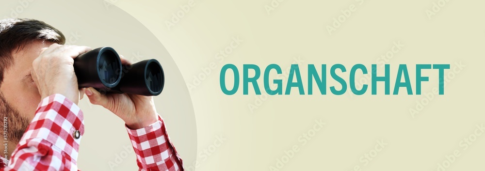 Organschaft. Mann bei Beobachtung mit Fernglas. Text/Wort in deutsch auf Hintergrund (beige). Panorama Format