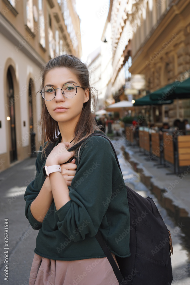 woman tourist walking on the street, summer fashion style, travel to Europe