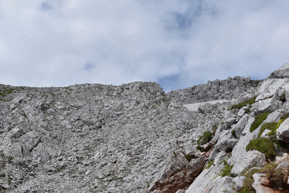 Schneefeld im Gebirge, Rest von Schneefeld mit Felsstaub, Schneeschmelze, Schneefelder schmelzen