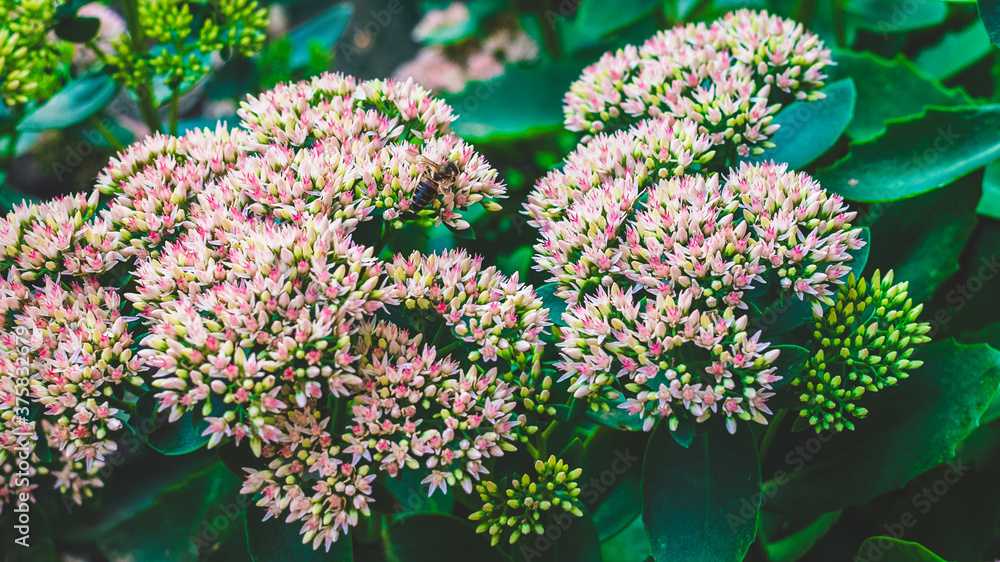 beautiful little pink and white flowers of a sedum plant and a bee
