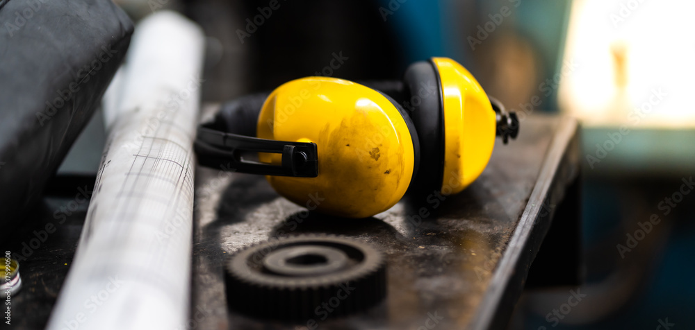Yellow Protective ear muffs and blueprint on desk in Heavy Industry Manufacturing Facility.