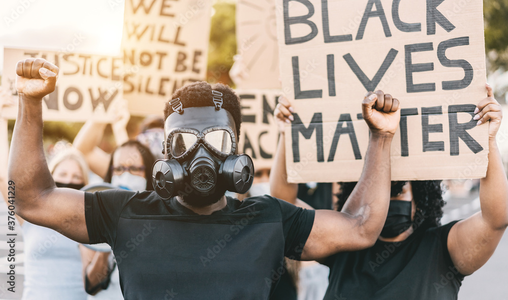 People from different culture and races protest on the street for equal rights - Demonstrators wearing face and gas masks during black lives matter fight campaign - Focus on black gas mask