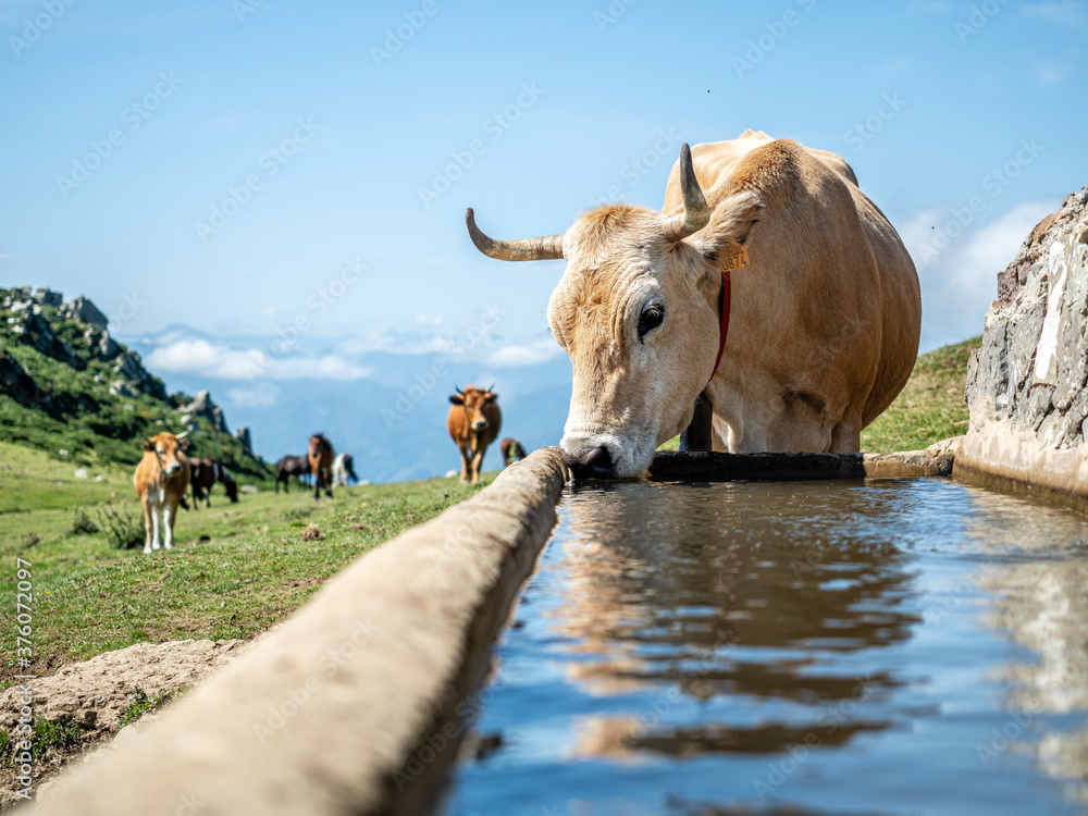 Vaca abrevando en el monte