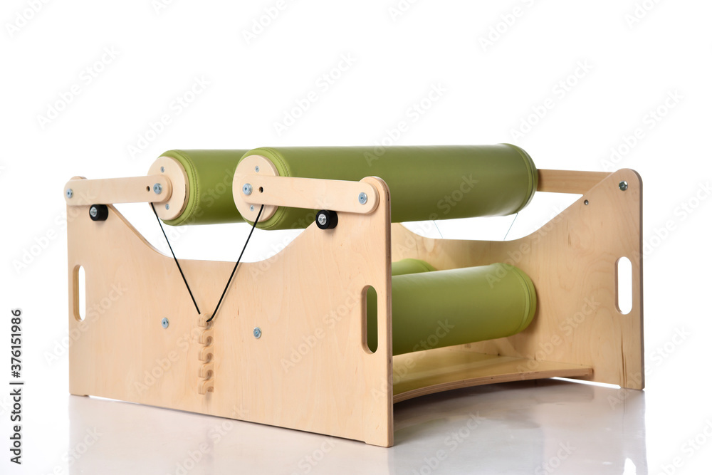 Compact exercise equipment with soft rollers set for children with musculoskeletal disorders, isolated on white, copy space