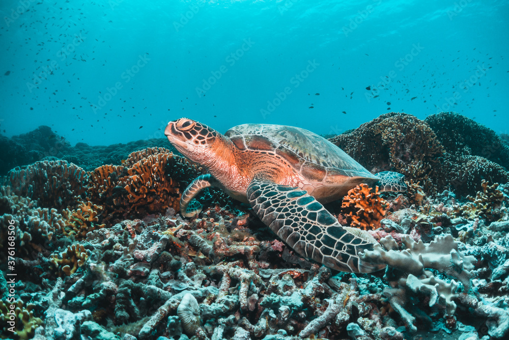 Sea turtle in the wild, resting underwater among colorful coral reef in clear blue water, Indonesia, Gili Trawangan