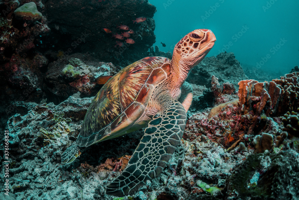 Sea turtle in the wild, resting underwater among colorful coral reef in clear blue water, Indonesia, Gili Trawangan