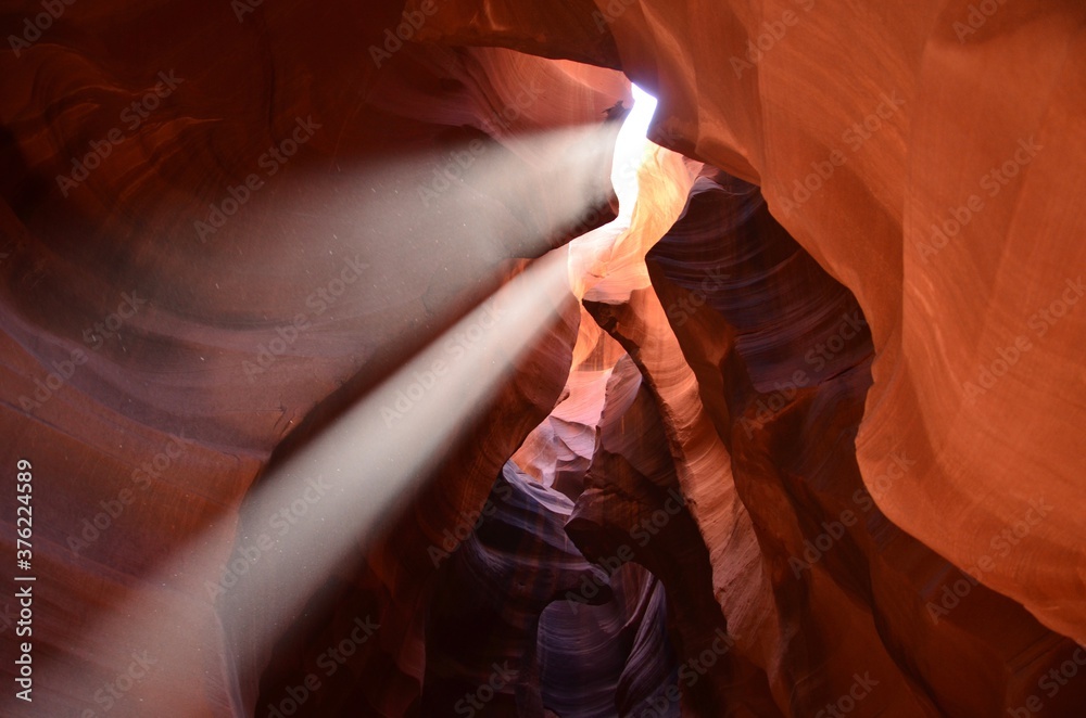 Upper Antelope Canyon near the town of Page in Arizona, beams of sunlight in the middle, prime time, noonday
