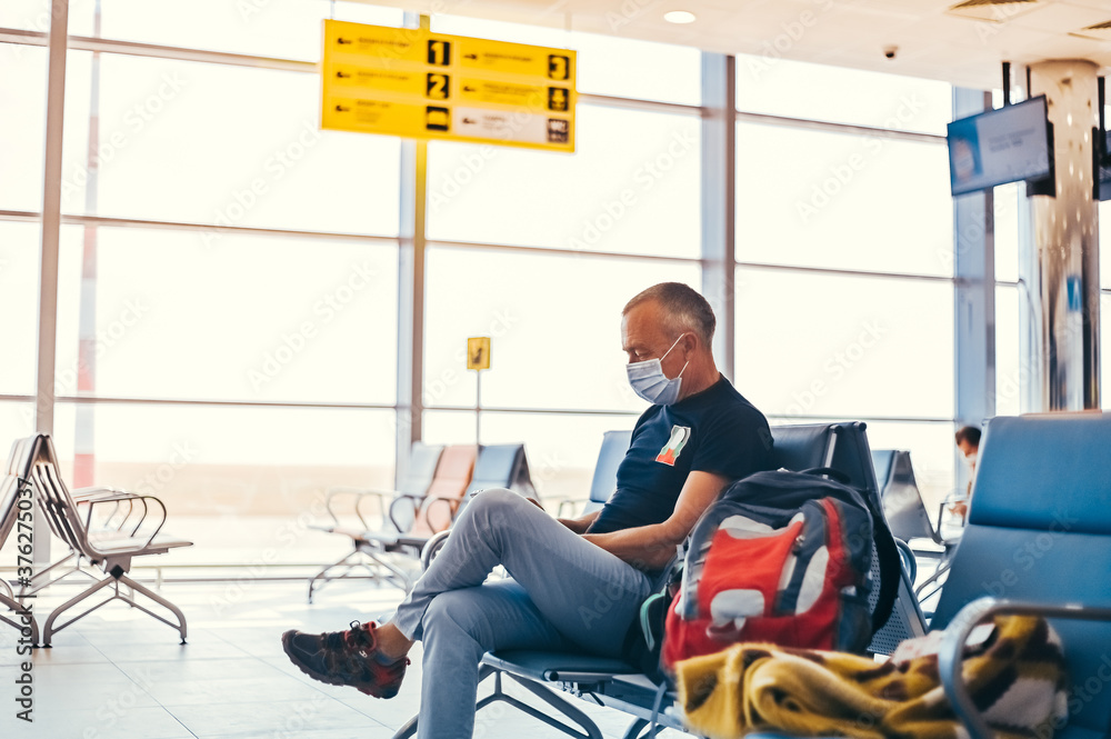 Airport attractive old man tourist boarding plane taking a flight wearing face mask. Coronavirus flu virus travel concept banner panorama.