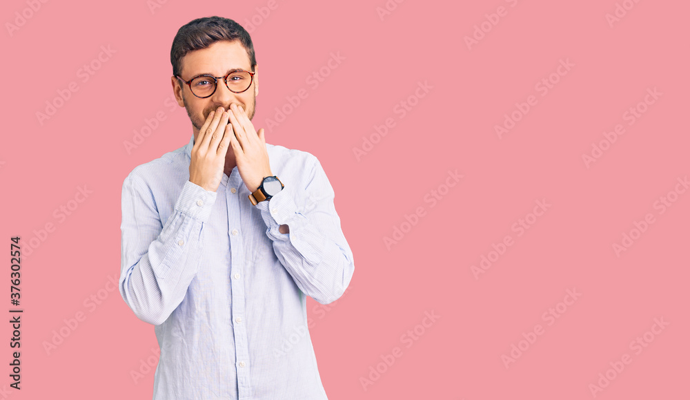 Handsome young man with bear wearing elegant business shirt and glasses laughing and embarrassed giggle covering mouth with hands, gossip and scandal concept