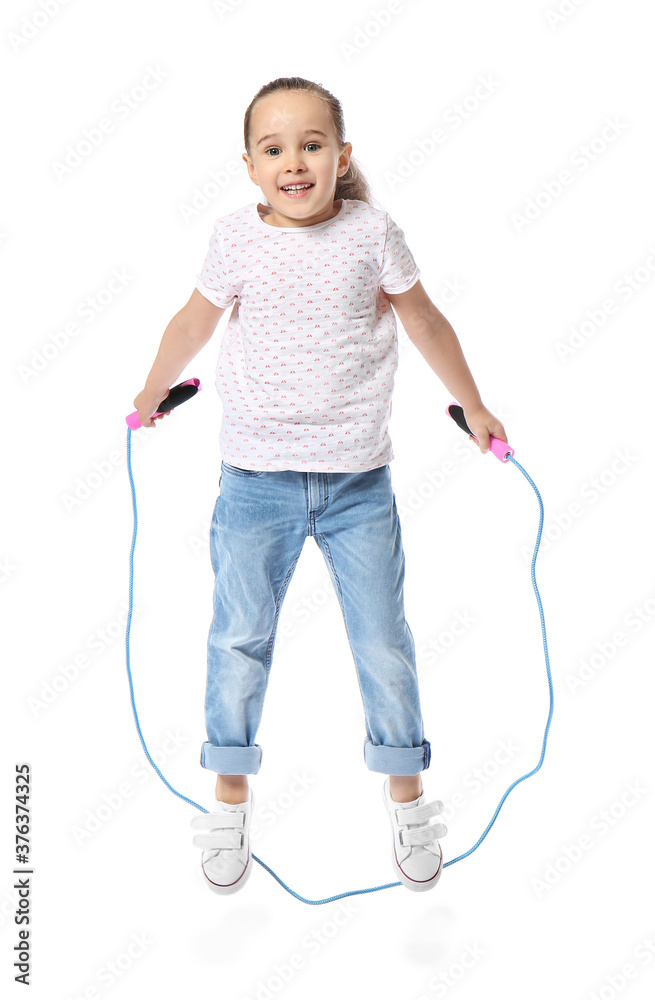 Cute little girl jumping rope against white background