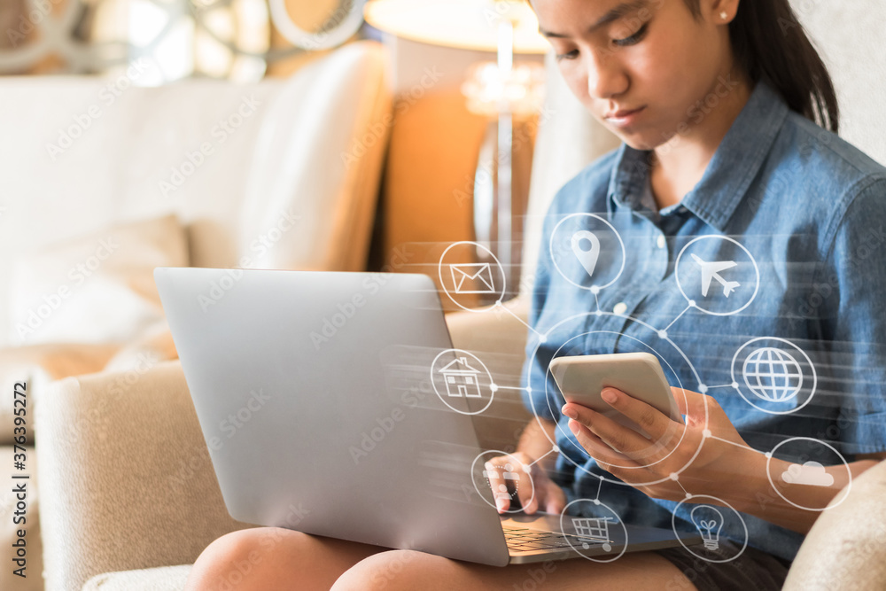 Internet of things - IOT and digital marketing via multi-channel communication network concept with young student or teenager girl using computer, mobile smartphone app technology studying at home