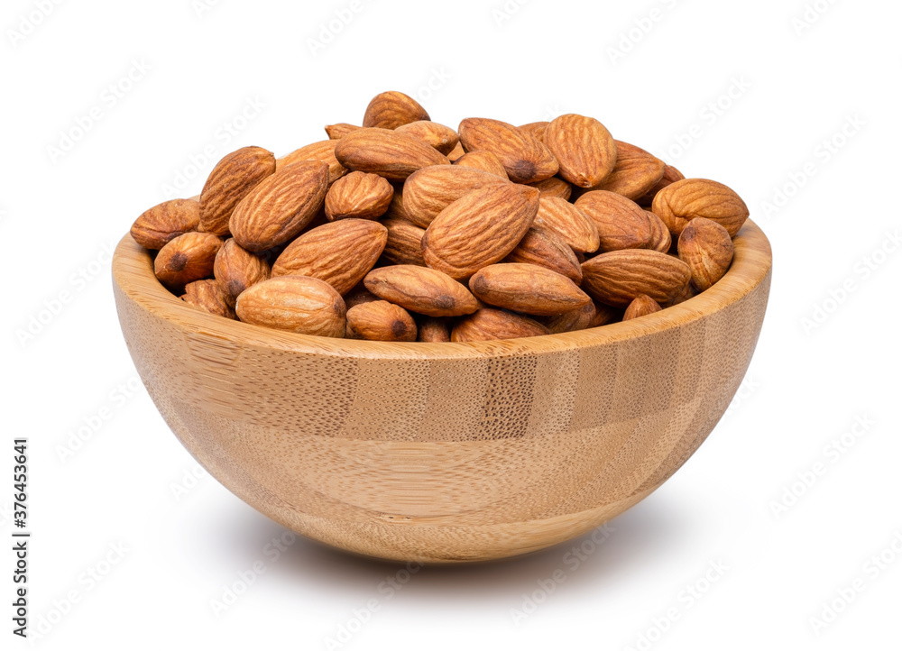 Fresh almonds nut in wooden bowl isolated on white background with clipping path.