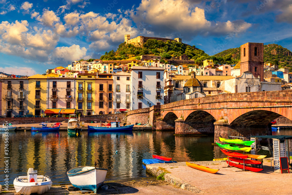 Beautiful view of Bosa town, Sardinia island, Italy. Travel destination. Bosa town with Ponte Vecchio bridge across the Temo river. Marvelous morning view of Sardinia island, Italy, Europe.