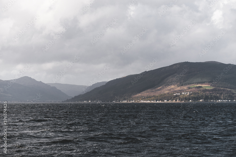 Rocky shore of the Firth of Clyde river, panoramic view from a sailing boat. Dramatic sky after the storm. Scotland, UK. Travel destinations, eco tourism, vacations, pure nature. Atmospheric landscape