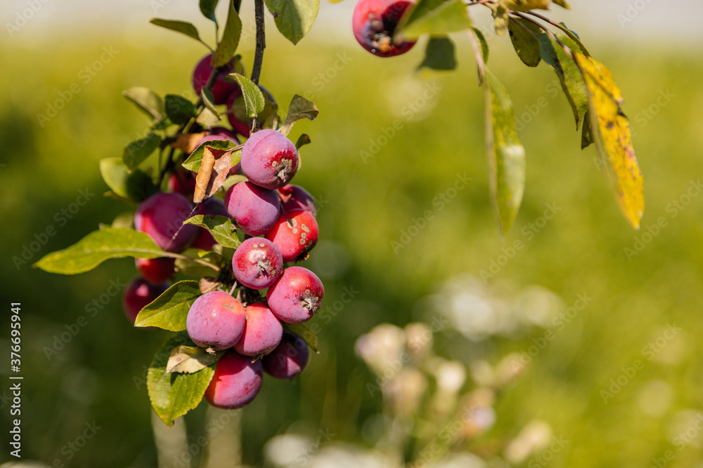 Apple tree with bunches of fresh fruit among the green leaves on a sunny day