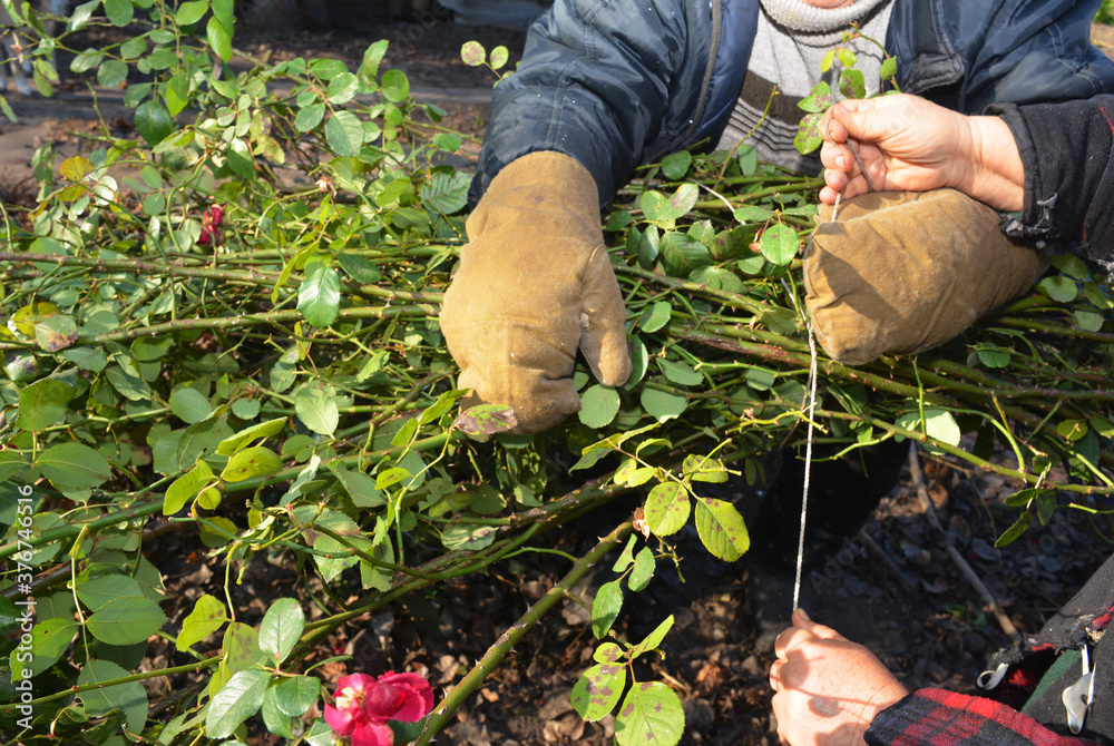 Two gardeners in thick protective gloves are preparing a climbing rose for winter by tying, leaning the tree over, and burying it in autumn to protect it from low temperatures, frosts.