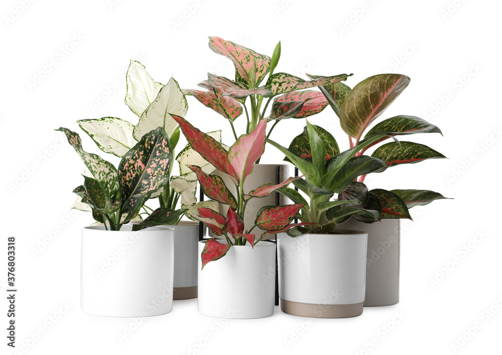 Beautiful Aglaonema plants in flowerpots isolated on white. House decor