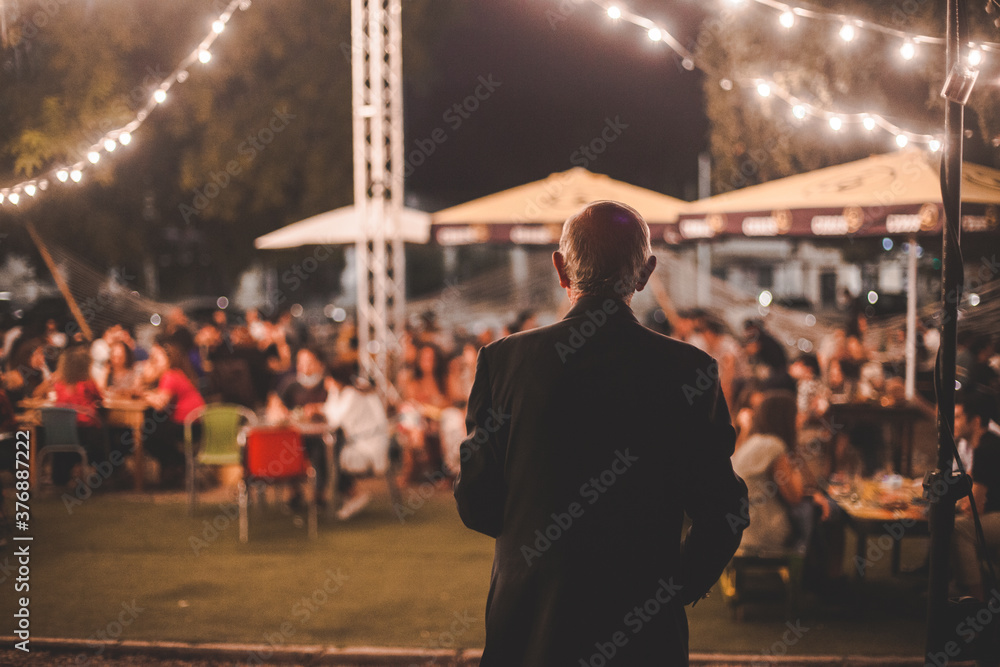 Persona anziana in giacca di spalle guarda in solitudine la gente seduta ai tavoli di un locale all'aperto di sera
