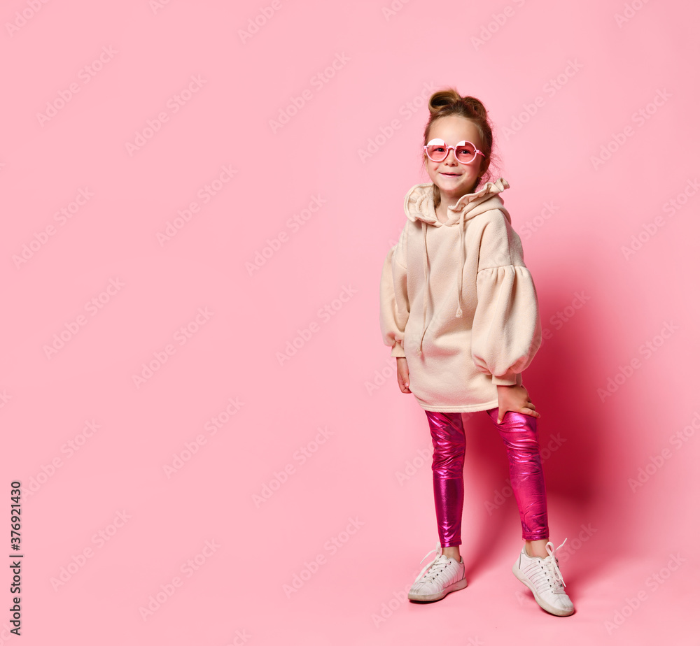 little girl in stylish pink clothes and round glasses posing leaning forward. Full length shot isolated on pink, copy space.