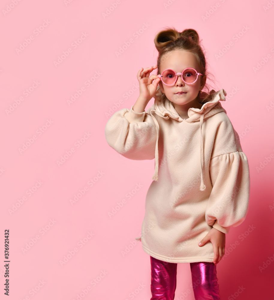 Little blonde girl in glasses, stylish hoodie and leggings. Looking at you intently or scared, posing on pink studio background. Close up, copy space