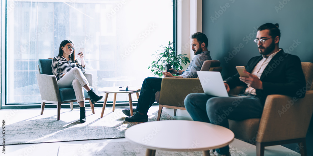 Coworkers sitting in lounge zone with big window