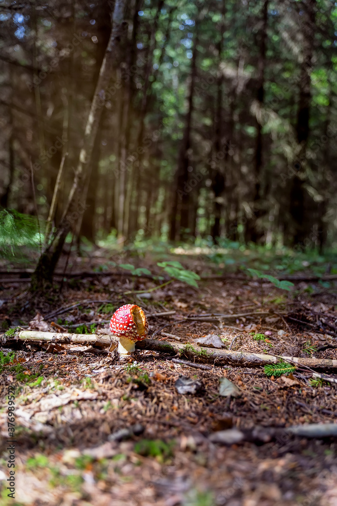 Poisonous fly agaric with eaten hat in deciduous forest, summer day in the forest, natural landscape