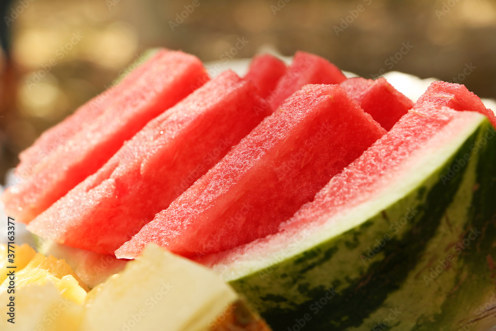 Close up photography of the divided into slices watermelon and melon.Outdoor picnic.Summertime concept.