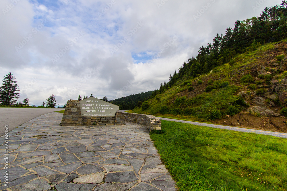 Sign designating the summit and highest point of the Blue Ridge Parkway in North Carolina. Sign was placed by the federal government and not private property.
