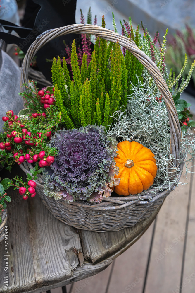 Autumn decor, wicker basket with pumpkin, plants and berries. Harvest holidays, Thanksgiving Day, Halloween, harvest concept. Colorful background