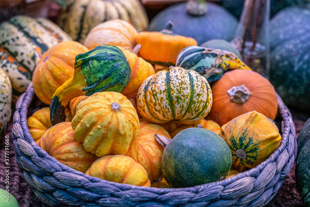 Autumn still life with assorted pumpkins in wicker basket, rustic stile. Thanksgiving and Halloween concept, harvest, colorful background