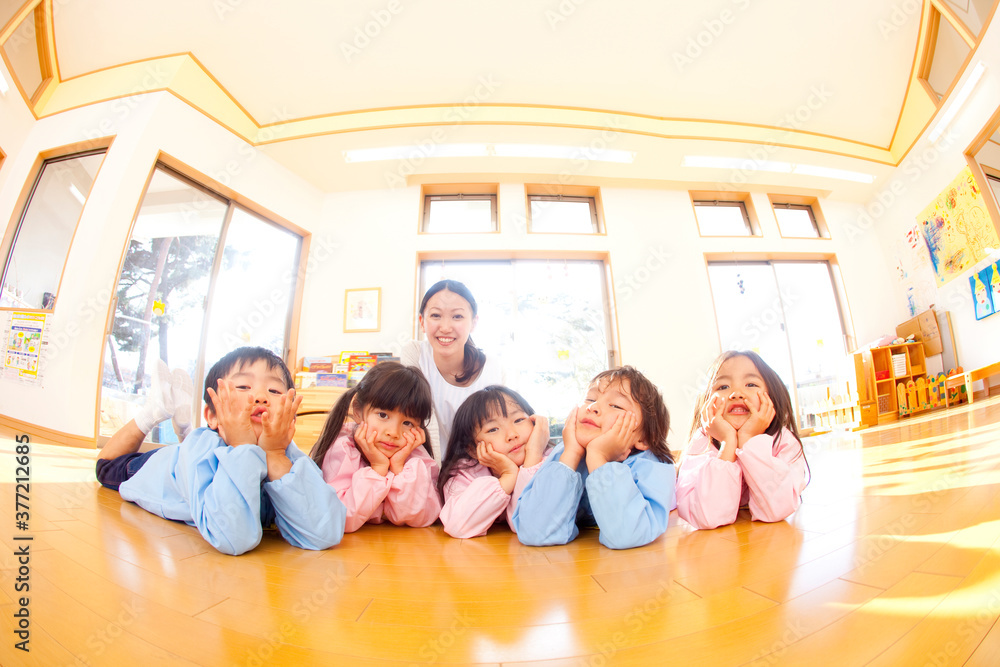 頬杖をつく幼稚園児と笑顔の幼稚園教諭