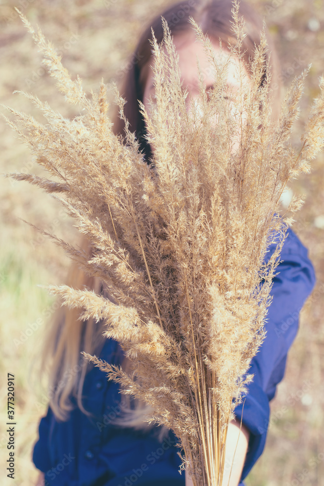 Toned photo of woman hide behind large fluffy bouquet made of dried yellow bushgrass holding in hand. Vertical format