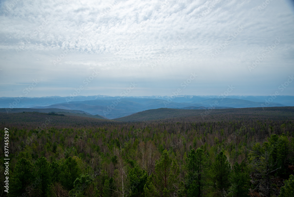 nature, summer landscape, wildflowers and meadow, spruces on hills, beautiful cloudy sky. Mountain landscape.