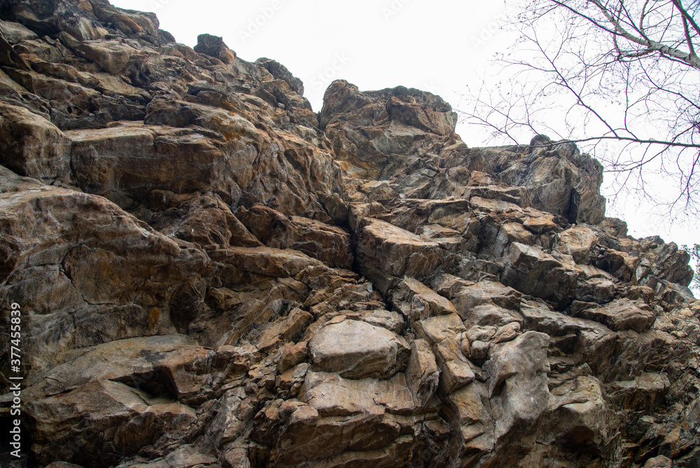 Stone mountains. Stone texture. Mountain gorge. Among the huge rocky mountains there is a mountain river, the mountains are covered with fresh bright green foliage of trees in early spring.