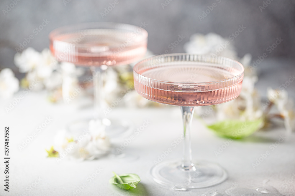 Homemade pink vodka cosmopolitan cocktail drink in crystal glasses