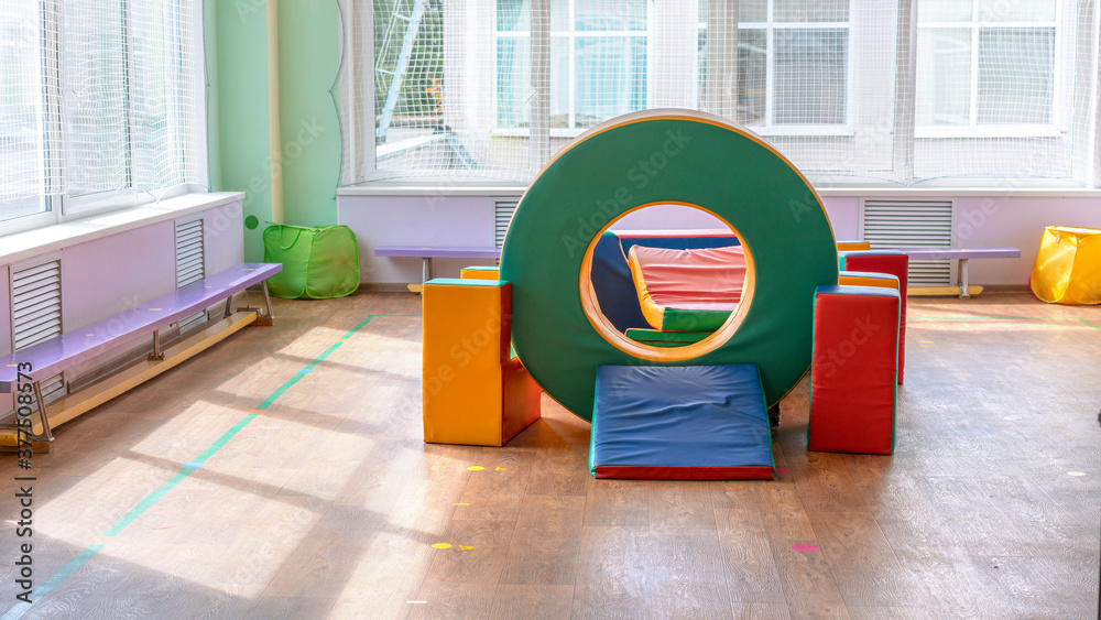large gym hall with fitness sport equipment for PT lesson in kindergarten or school
