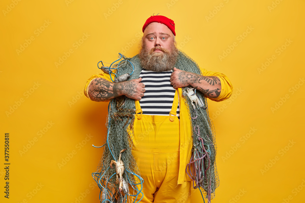 Serious plump bearded experienced man sailor poses with fishing gears, wears striped sailor shirt and overalls. Fisherman has sea adventure, poses indoor against yellow background. Hobby concept