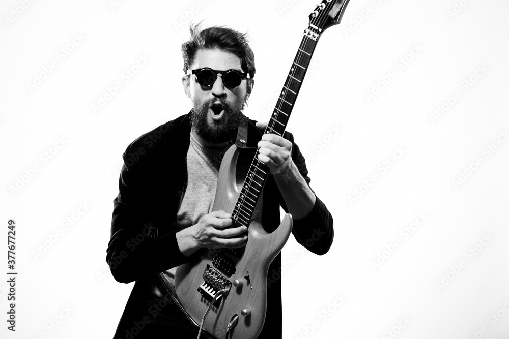 man with guitar in hands musician rock star performance lifestyle light background