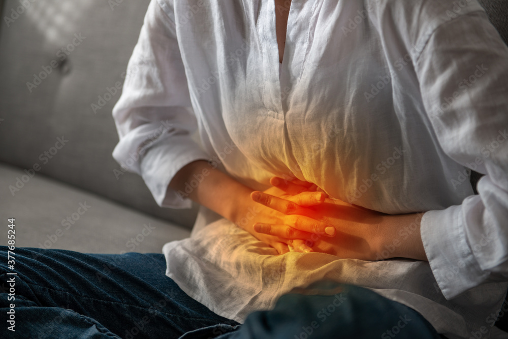 Young woman suffering from abdominal pain while sitting on couch at home. Gynecology concept