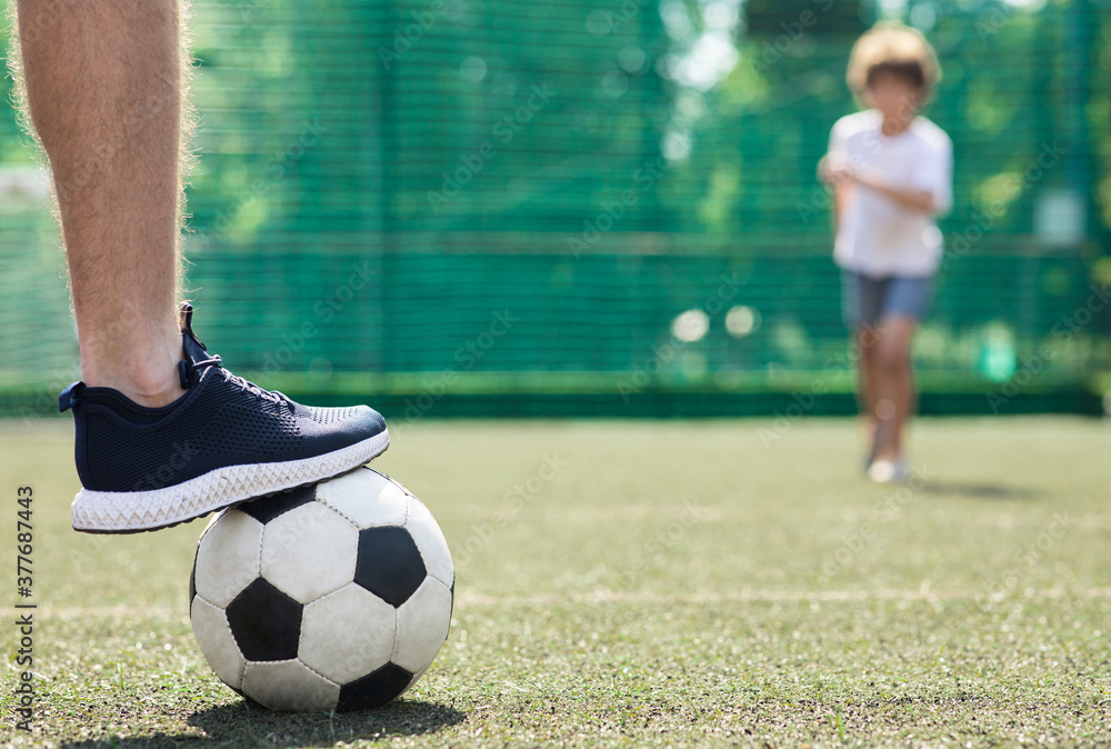 Player stepping on the soccer ball standing on green field