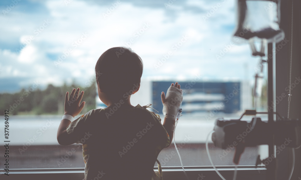 Toddler boy in intensive care unit or icu.Covid19 coronavirus.Little toddler boy wearing IV tube looking out window in hospital.Sick patient child baby boy in icu.Cancer, Pediatric, Dengue fever.