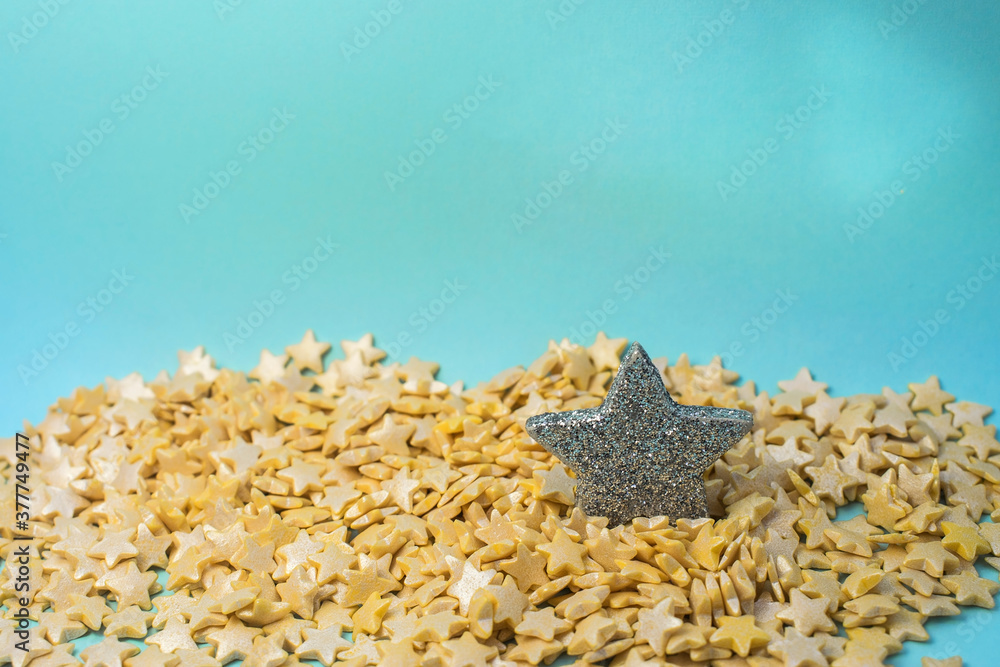 on the blue background below, yellow confetti is scattered in the form of stars, among which there is one bright star. New year's composition for advertising greetings
