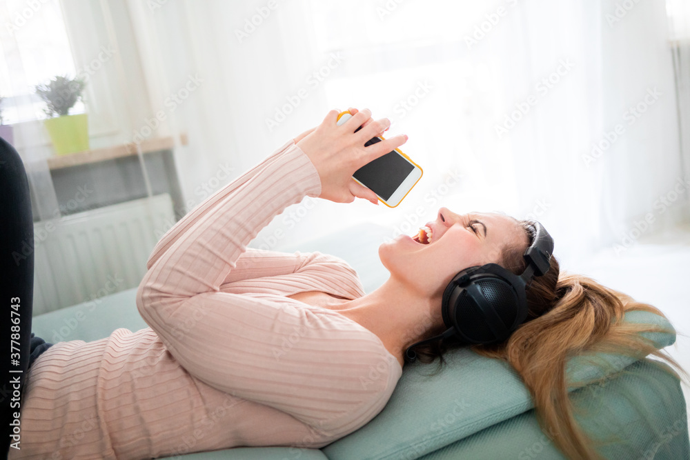 Smiling woman with headphones and smartphone listening music and singing at home