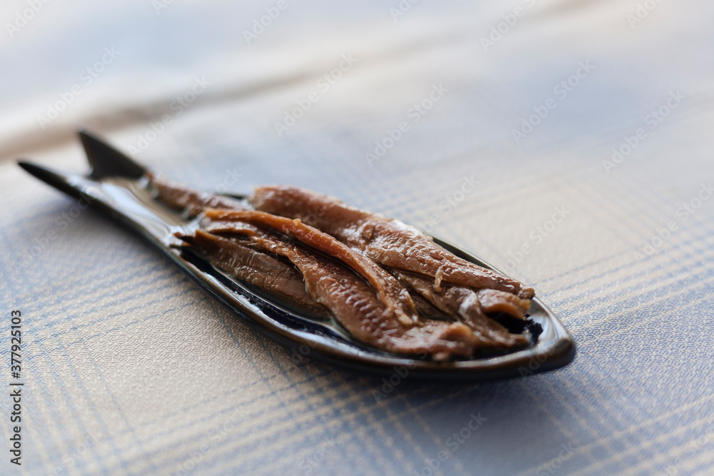 Canned anchovies caught in the Cantabrian Sea plated in a blue fish shaped plate served on a blue squared tablecloth. Anchovy is a typical high quality delicious tapas dish from the northern Spain.