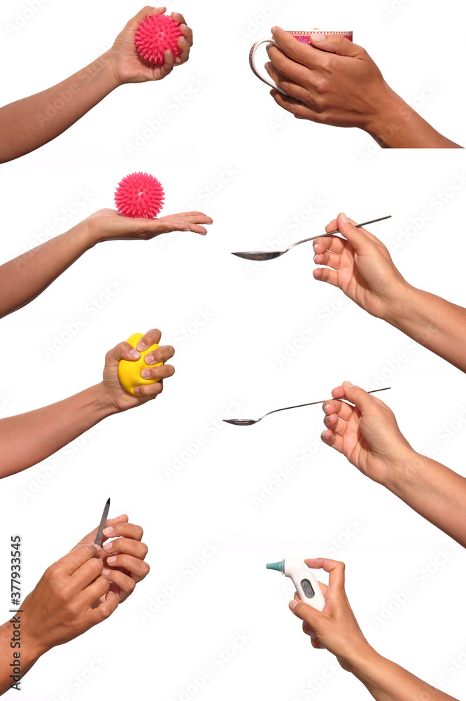 Frauenhände halten Hilfsmittel wie Stressball, Löffel, Tee, Tasse, Fieberthermometer oder Feile für Stärkung bei Krankheit, Wellness und Wohlbefinden und Prävention vor weißem Hintergrund