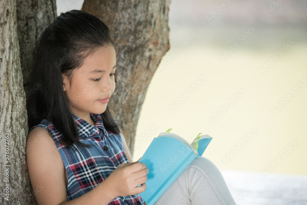 little asian girl reading a book under big tree. children and science. blurred background. learning the imagination and dreams of rural child. studying at home.