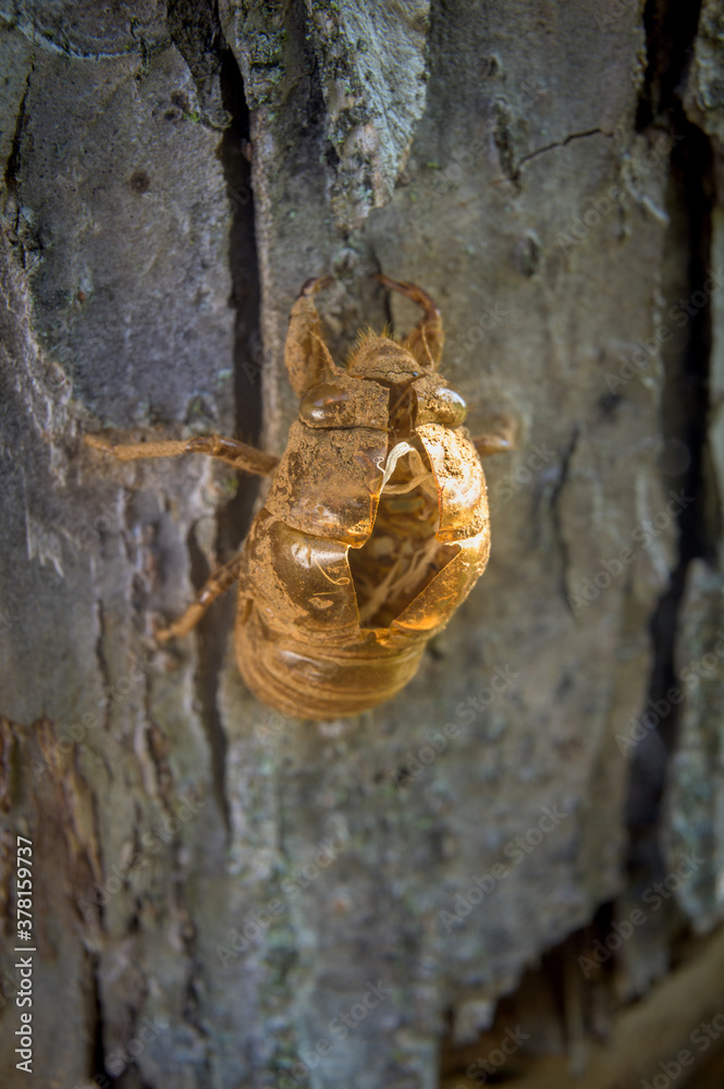 Discarded cicada shell left empty on tree bark, in Pennsylvania, PA, USA
